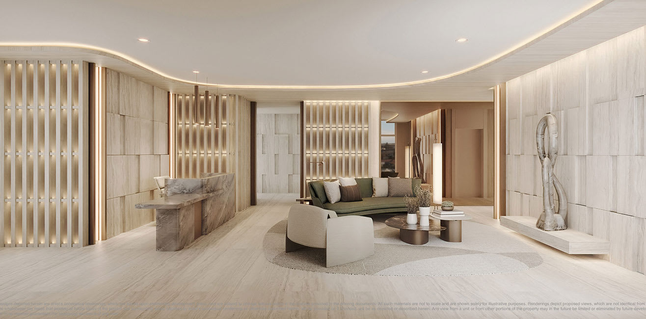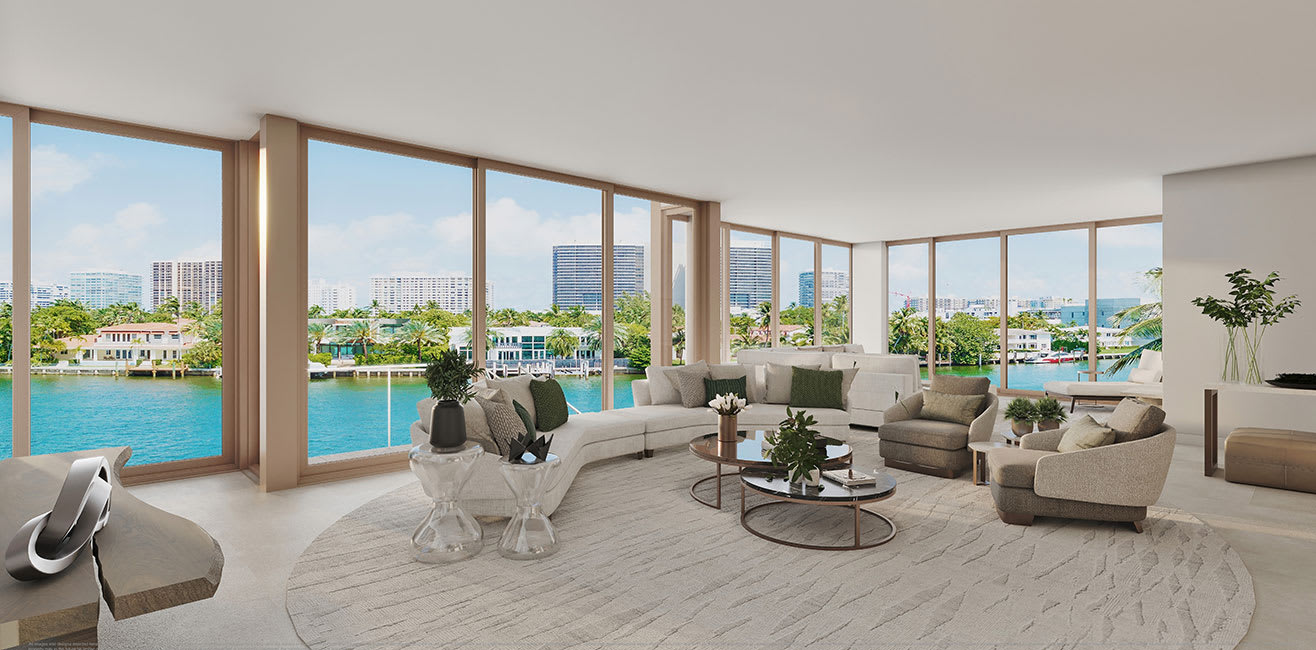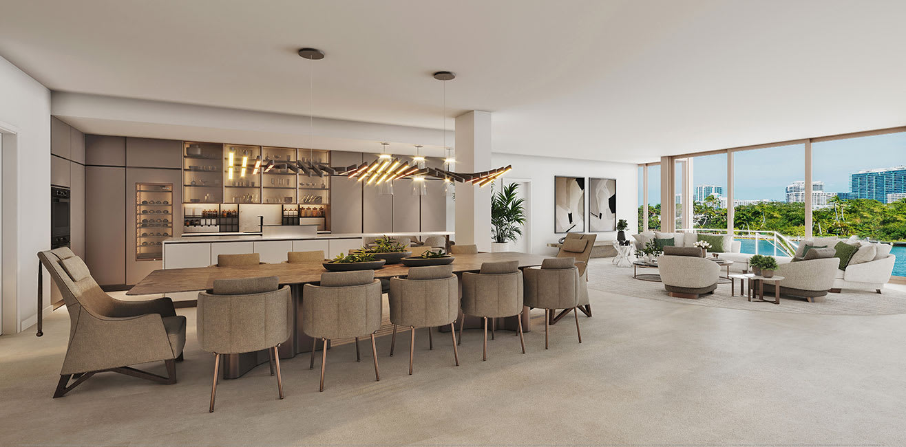 The Signature Collection is a beautiful, glass-clad modern building designed by Kobi Karp Architecture with a soft, natural interior palette created by Debora Aguiar Arquitetos that features an exclusive collection of just 9 residences. The waterfront location offers boat slips, waterside amenities, and a landscaped rooftop pool deck. The large floor plans, surrounded by floor-to-ceiling glass exterior walls and terraces, feature a measured progression of rooms and spaces that feels luxurious and distinctive, with private and semi-private elevators that add to the feeling of retreat. The building is uniquely oriented on the island, facing east over the water to allow sunlight to move through the homes from sunrise to sunset as it travels along its southern axis and facilitates airflow throughout each residence.
