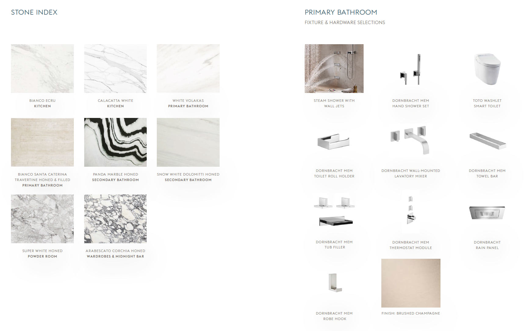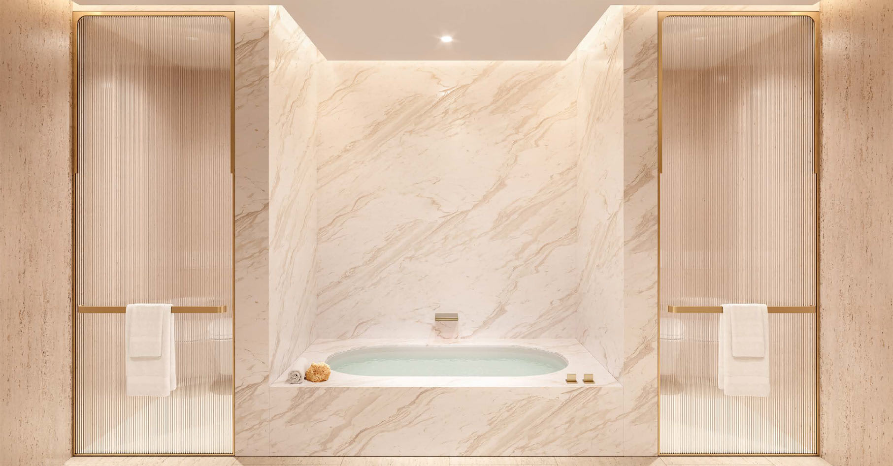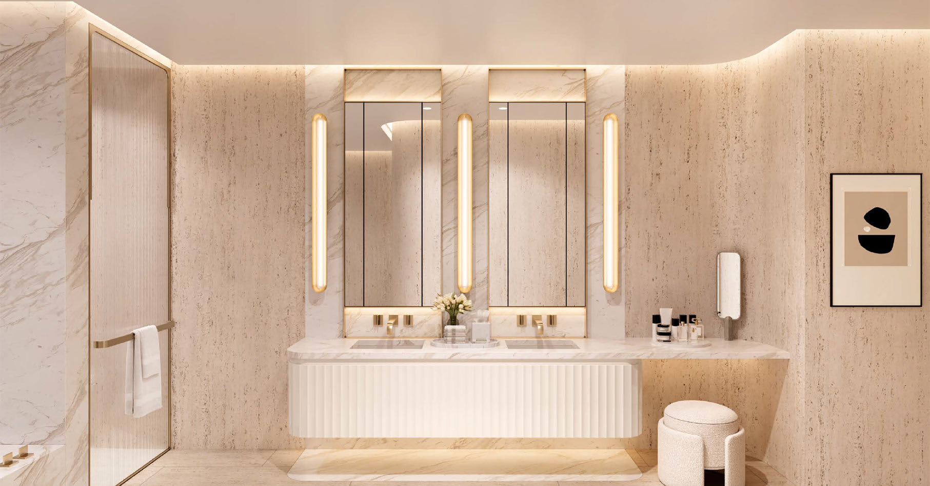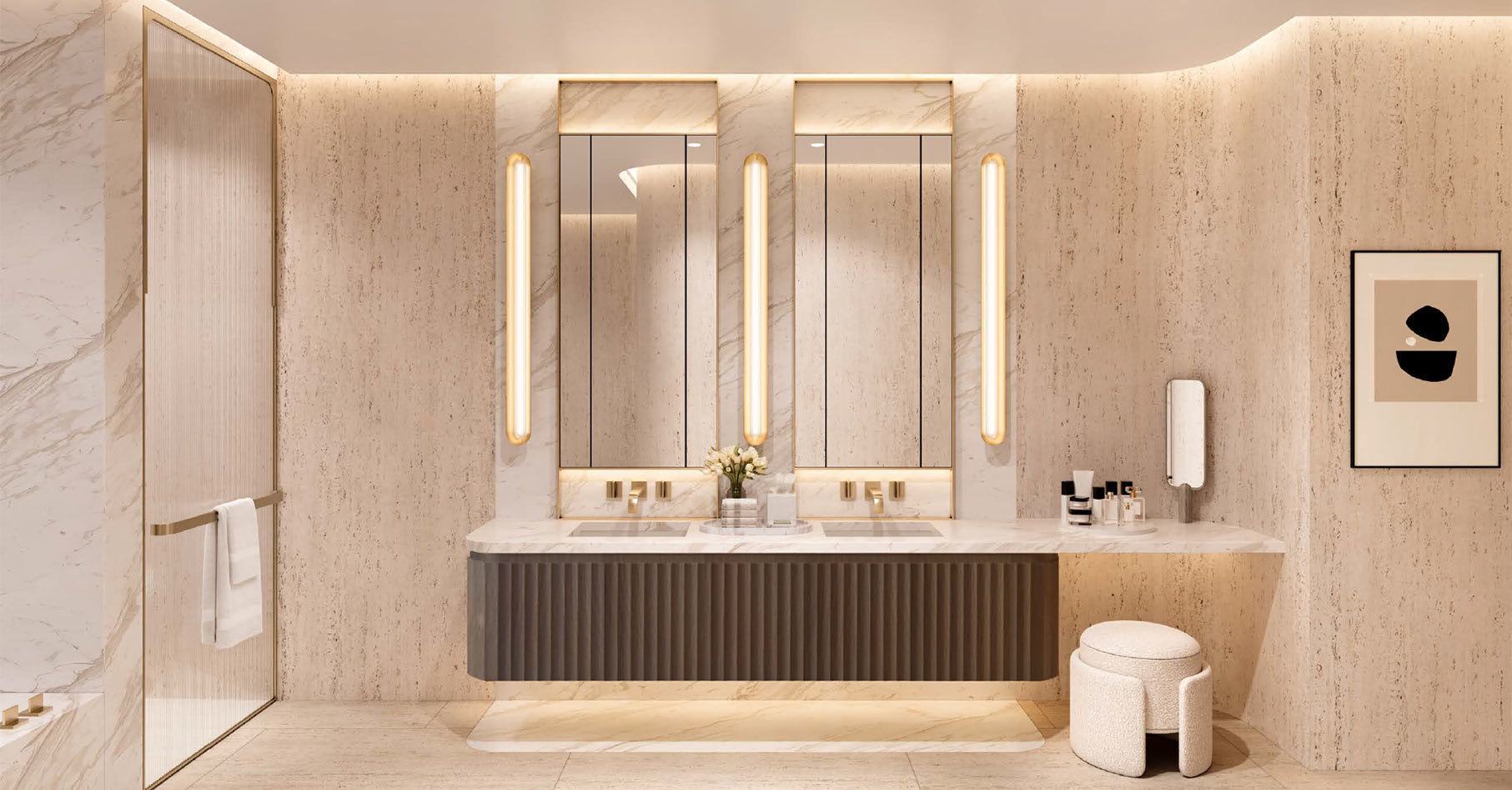 The bathrooms, carefully appointed to exceed all expectations, reflect Rivage Bal Harbour's elevated lifestyle. A rich palette of sophisticated materials and lustrous finishes includes hand-selected European and American stone, custom fittings and Dornbracht fixtures.