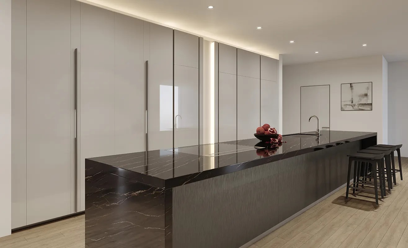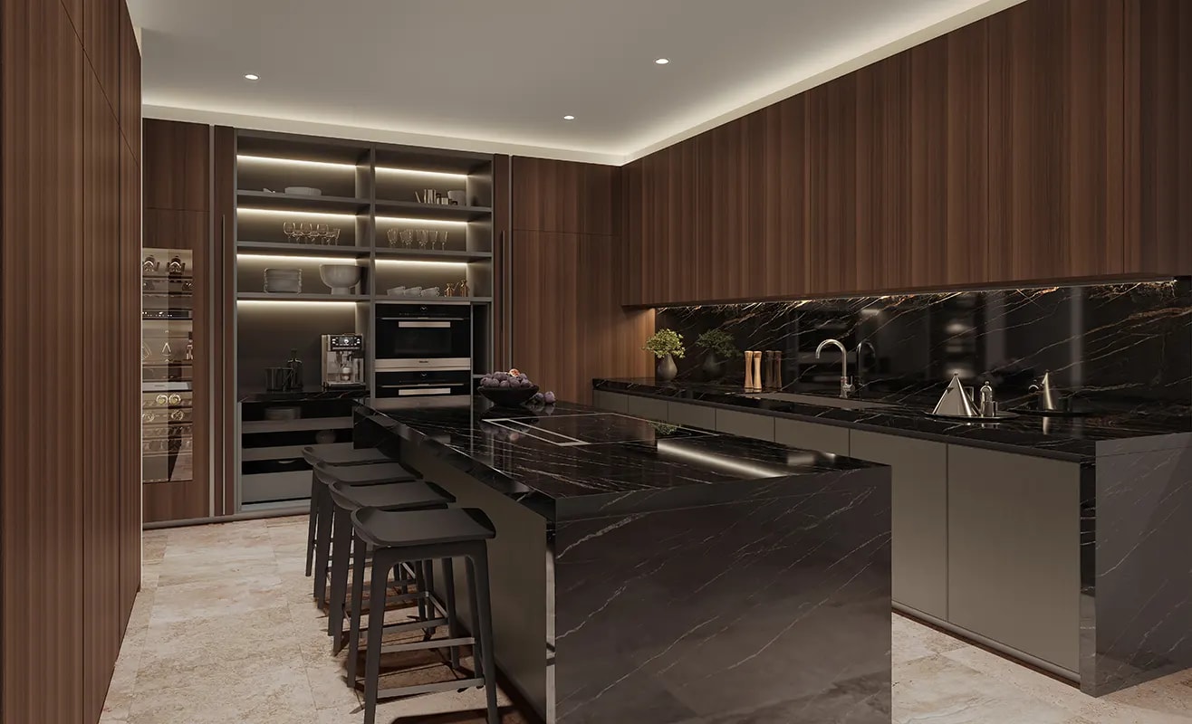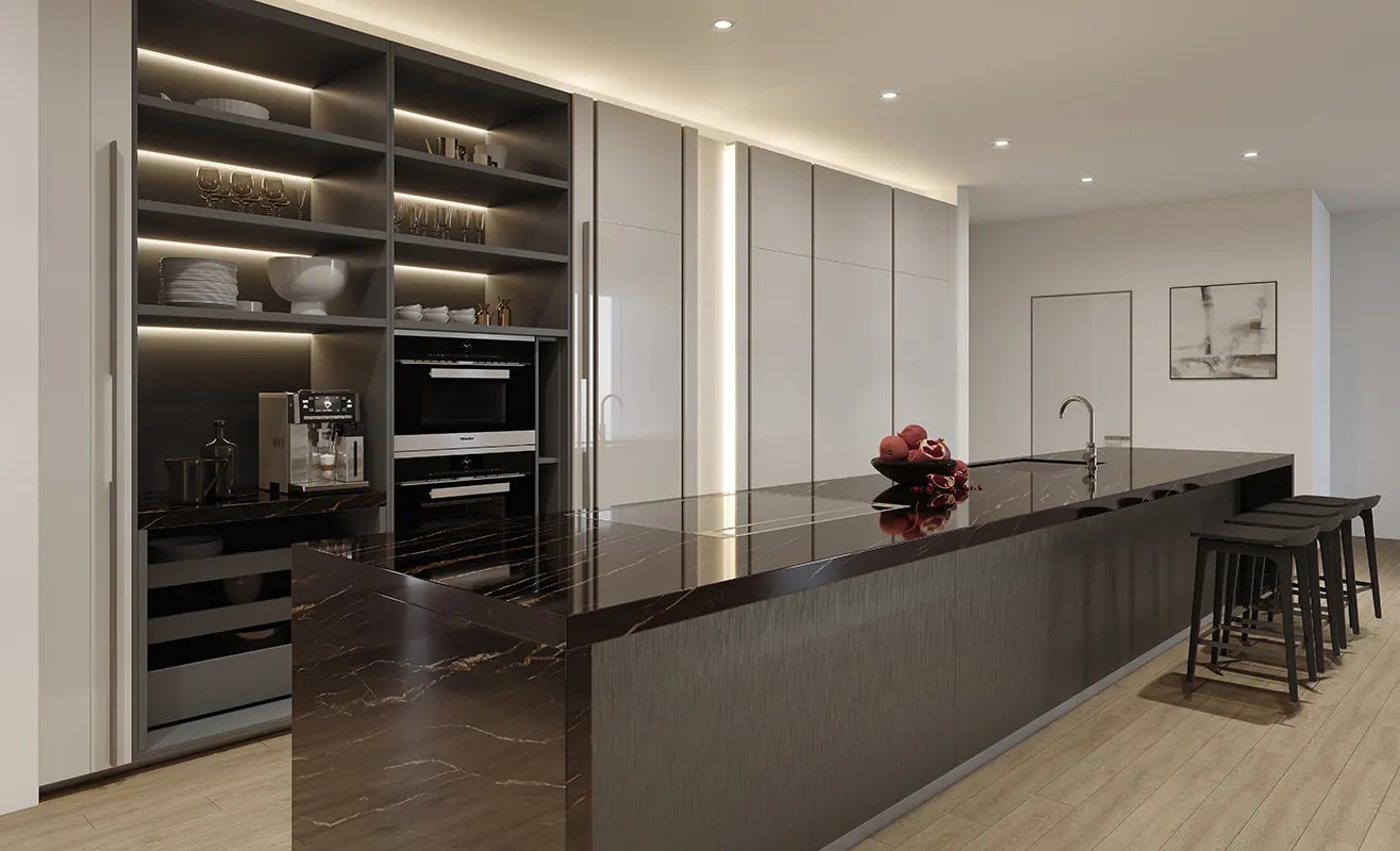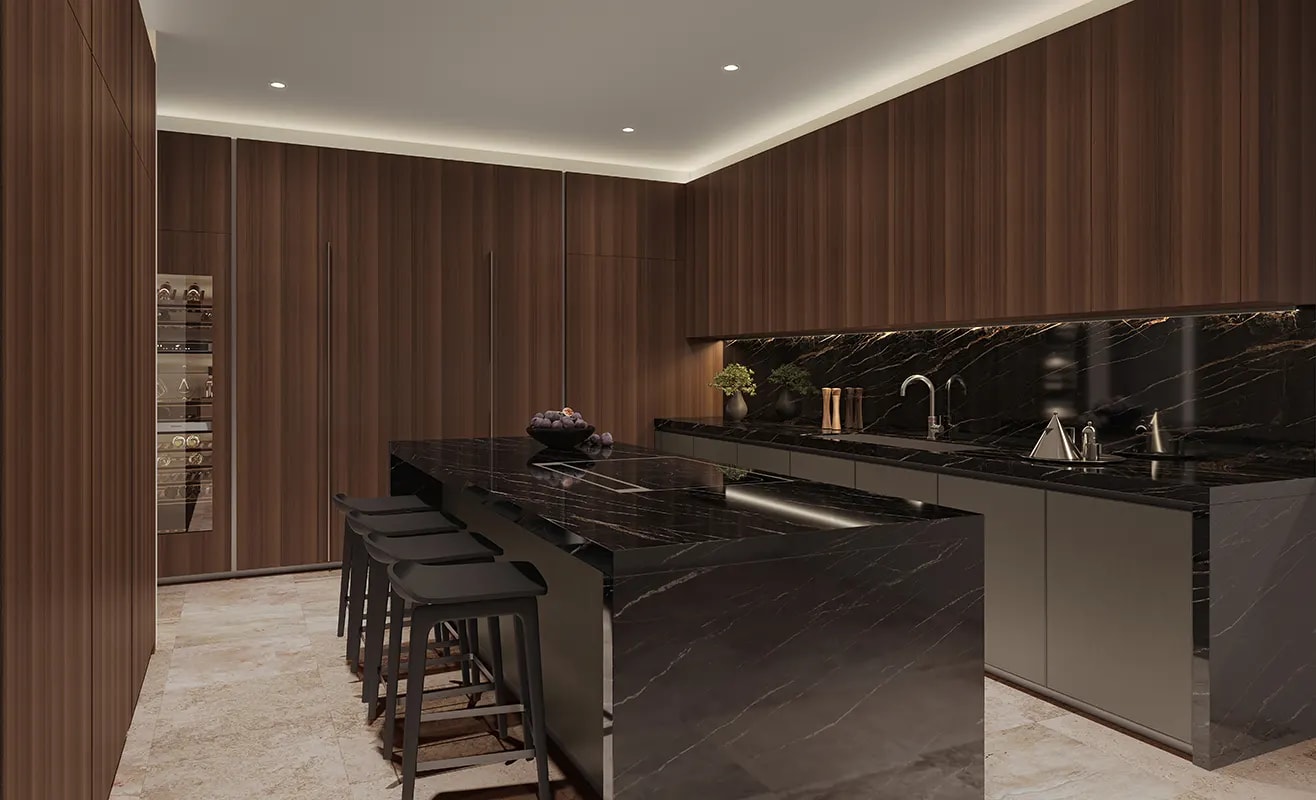 Elegance meets optimal functionality in Vita's chef-caliber kitchens featuring custom designed and manufactured wood and lacquer cabinetry by Molteni&C— Italy's preeminent kitchen manufacturer. Kitchens in residences and penthouses are designed in an open-plan configuration that complements Vita's flowing contemporary floor plans. Elegant wood and lacquer cabinetry and concealed appliances create a very contemporary appearance. Residents who prefer a more traditional ambience and definition of spaces will find that kitchens can easily be enclosed.
