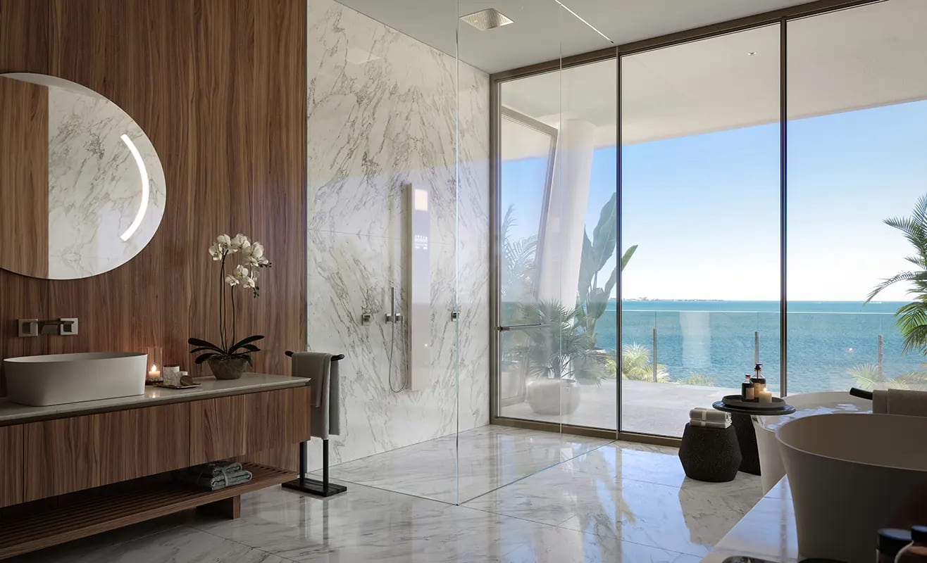 Designed with a variety of marble from Italian quarries hand-selected and masterfully crafted by the renowned Italian stonework company Margraf, every bathroom is a work of art. The custom natural Italian walnut cabinetry is by the prestigious Italian company Milldue. Accessories and fixtures are by the finest European manufacturers, ensuring a peerless balance of beauty and functionality.
